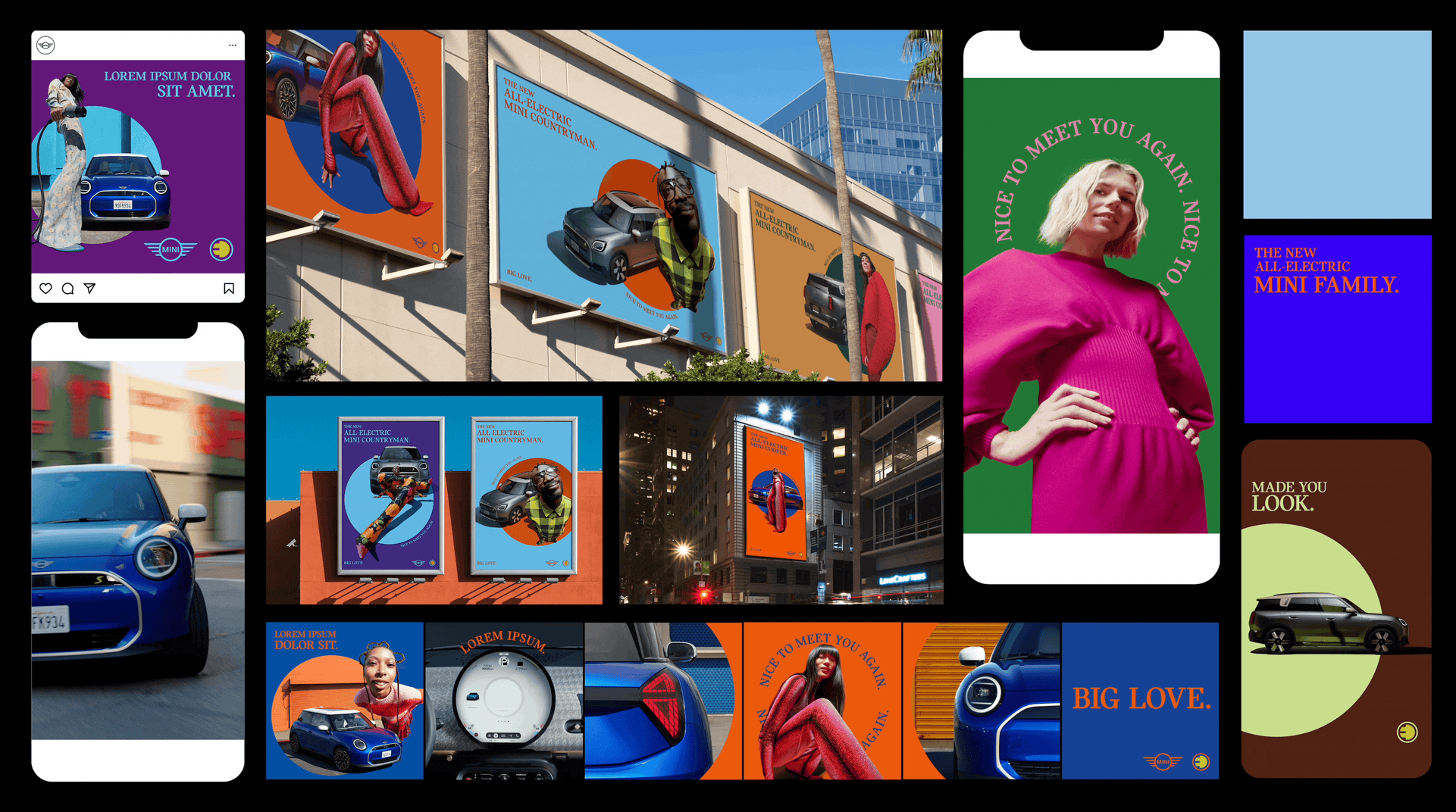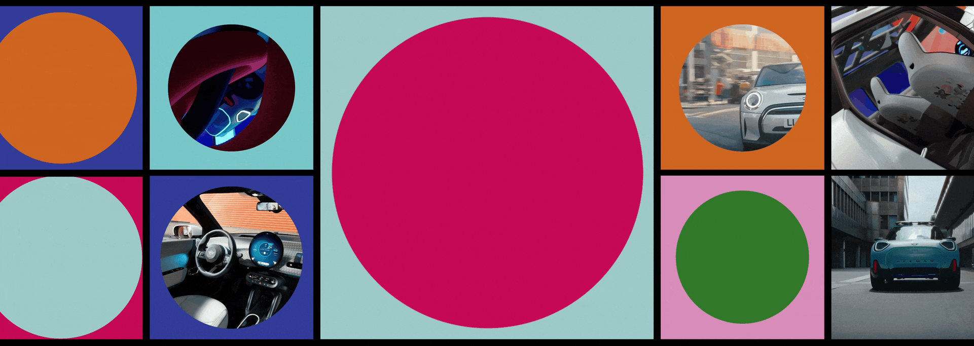 Circular design elements of the original MINI (and new models) provided inspiration for a simple yet powerful graphic device at the centre of the robust design system. The vibrant visual language was integrated into everything from car photography, TV adverts, event experiences, and an extensive digital campaign roll out.